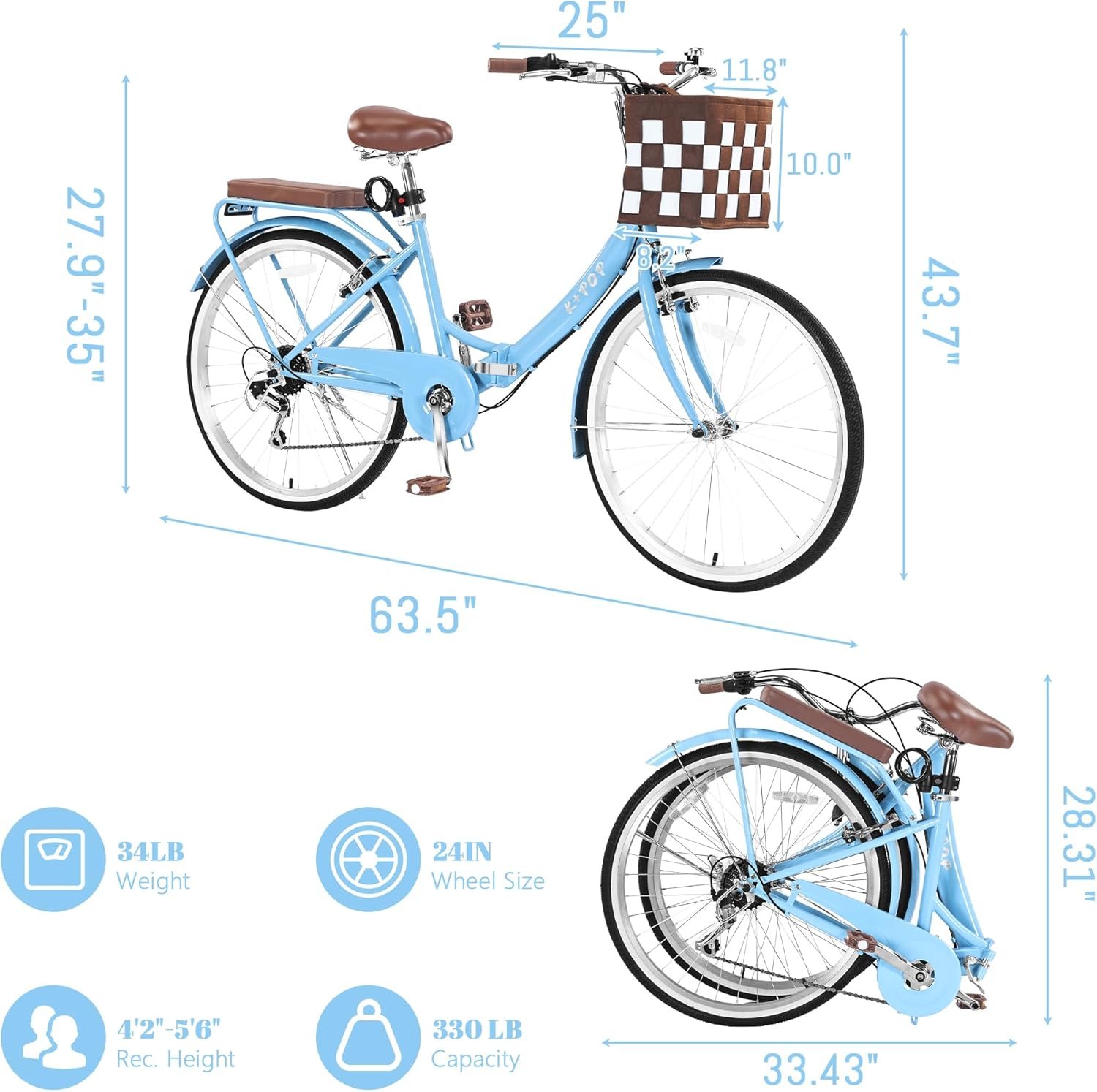 Equipped with front and rear V-type brakes, this beach cruiser bike provides responsive and reliable stopping power. The sensitive braking system helps ensure safe riding on various road surfaces, while the high-quality tires deliver smooth rolling performance and shock absorption for a stable and comfortable ride.