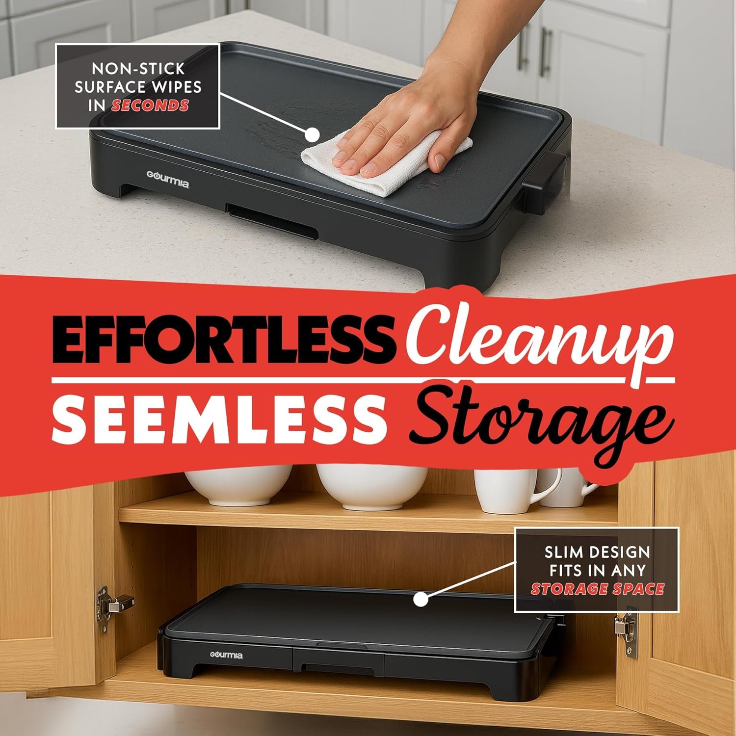 Designed with modern kitchens in mind, the griddle features a slim, handle-free profile that makes it easy to store neatly in cabinets when not in use. Its sleek design saves valuable countertop and storage space while still providing a large cooking area.