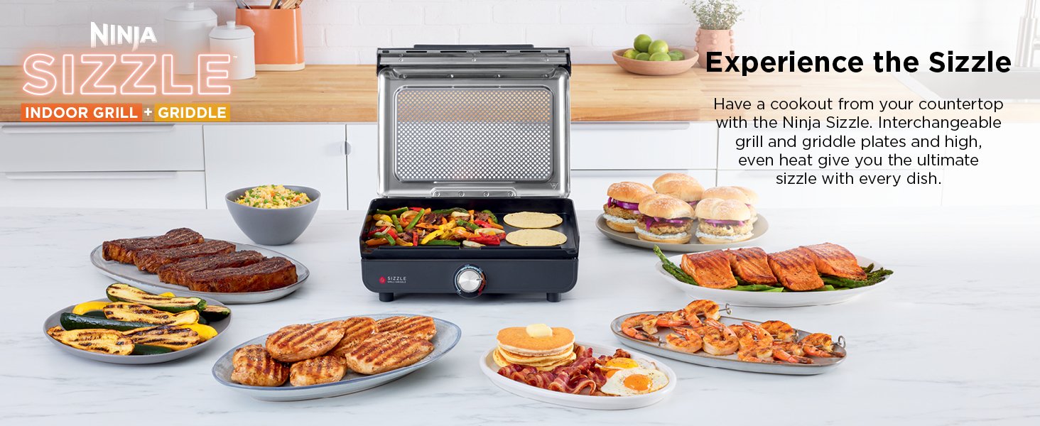 Ninja Sizzle Indoor Grill & Griddle, 14’’ Nonstick Grill Plate, 14’’ Nonstick Flat-Top Griddle Plate, and Quick Start Guide with 10 tasty recipes.